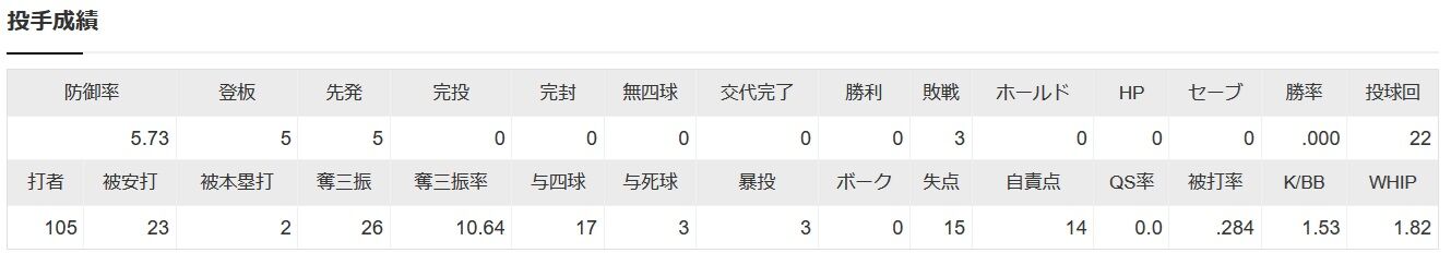 オリ山下舜平大 5.73 0勝3敗 被打率.284 WHIP1.82 K/BB1.53