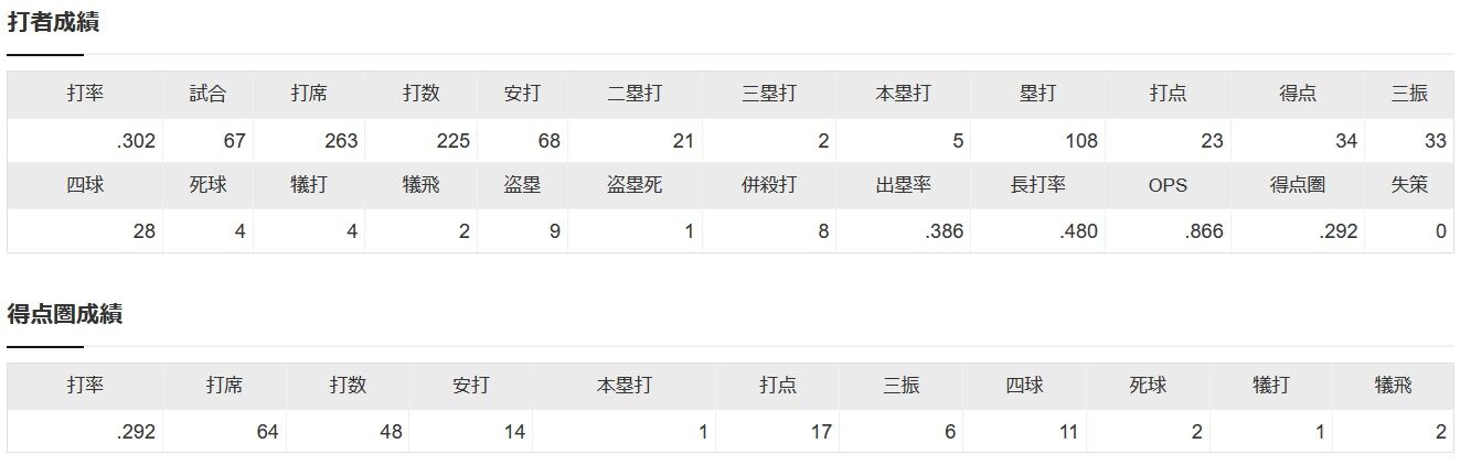 【3年2.1億】岡大海(ロ) .302(225-68) 21二塁打 5本塁打 23打点 9盗塁 OPS.866