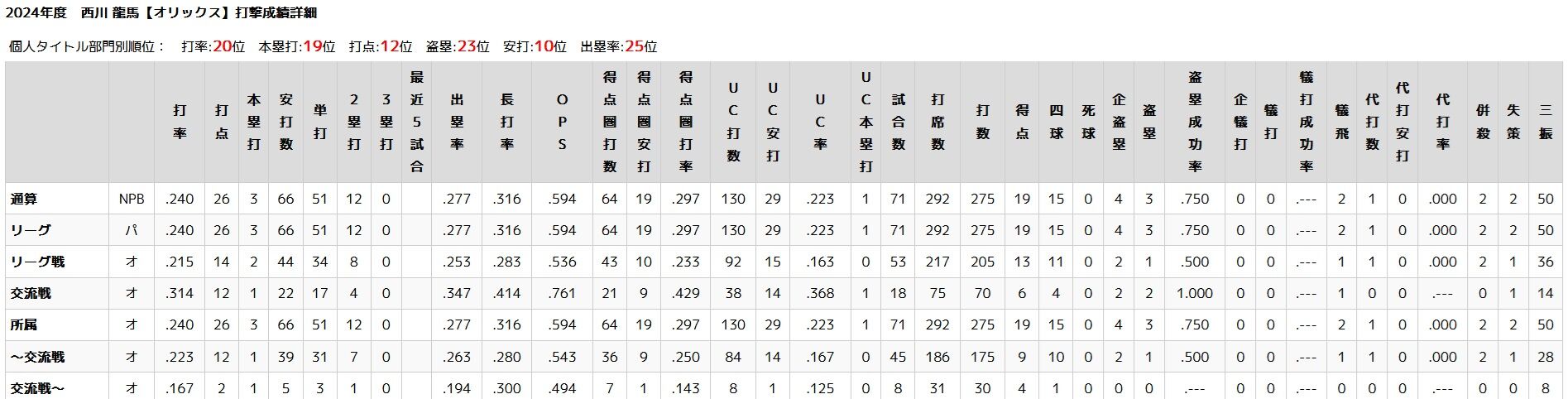 西川 龍馬(天賦) 交流戦前.223 交流戦.314 交流戦後.167
