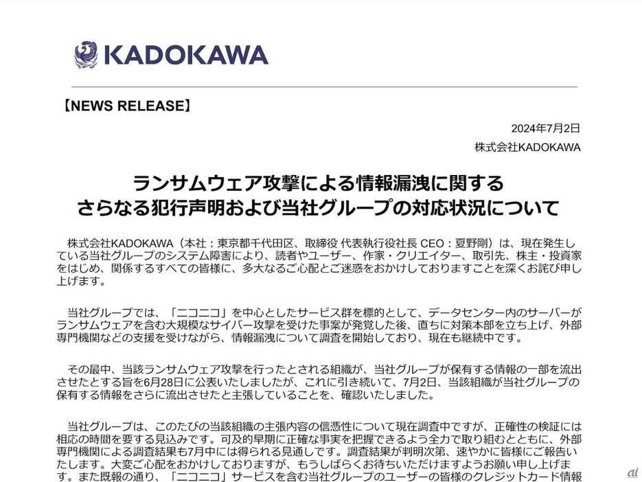 KADOKAWAは7月2日、サイバー攻撃による情報漏洩に関する最新の対応状況を明らかにした。
