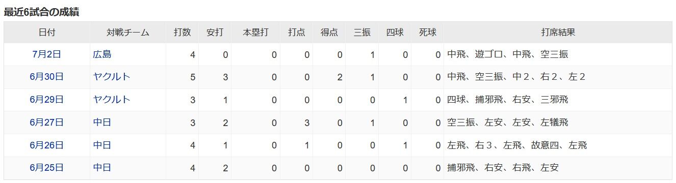 .391(23-9) 3三振 2四球 出塁率.500 長打率.609 OPS1.109