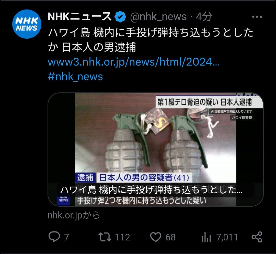 【悲報】日本人さん、ハワイで飛行機に手榴弾を持ち込もうとしたことにより第1級テロ脅迫の疑いで逮捕
