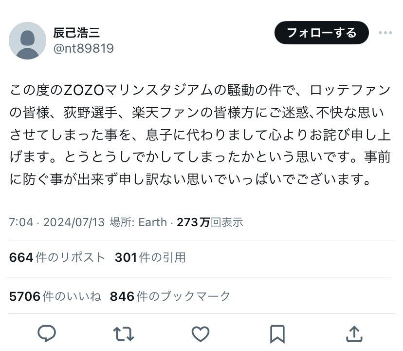 辰己父、謝罪