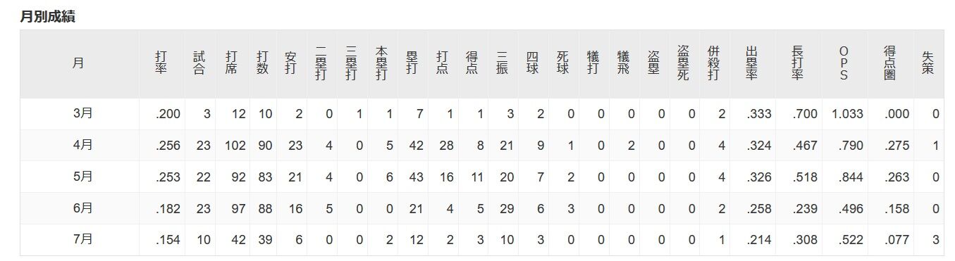 7月 .154 2本 2打点 出塁率.214 OPS.522