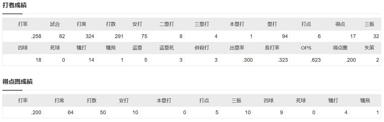 源田壮亮 82試合 打率.258 出塁率.300 OPS.623 5盗塁6打点17得点←これ