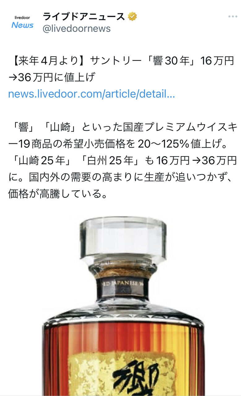 【悲報】ウイスキー、とんでもない値上げ