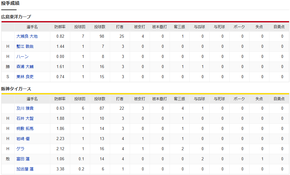 カープ63年ぶり甲子園6連勝!小園決勝犠飛!大瀬良7回無四球0封!塹江-ハーン-森浦-栗林完封リレー!野間2安打1盗塁!延長11回守り勝ちで3戦連続完封勝利!【広島1-0阪神/試合結果】