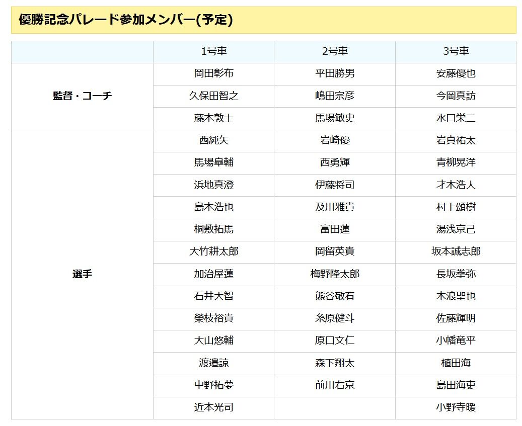 11月23日(木・祝)に開催される優勝記念パレードに参加する監督・コーチ・選手のメンバーが決定しましたのでお知らせいたします。