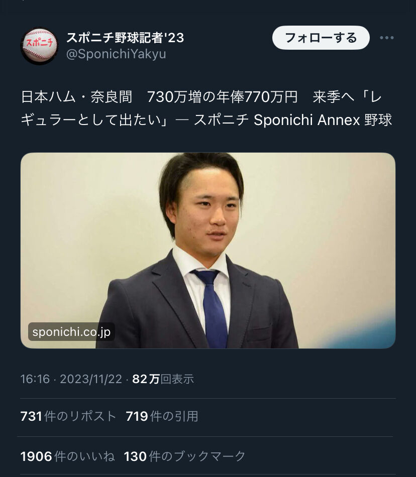 【誤植ネタ】日ハム奈良間、730万増の770万円でサイン! 2023年11月22日 最終更新日時 : 2023年11月22日 loki.5ch.net カープドラ6西川篤夢!「日本を代表する遊撃手になりたい」【ドラフト会議2025】 カープドラ5赤木晴哉!191cm最速153キロ!佛教大の本格派右腕!【ドラフト会議2025】 カープドラ4工藤泰己!159キロ北の剛腕!【ドラフト会議2025】 カープドラ3勝田成!近畿大163cmセカンド!菊池涼介の後継者候補!【ドラフト会議2025】 カープドラ2齊藤汰直!亜大152キロエース!【ドラフト会議2025】 カープドラ1平川蓮!187cmのスイッチヒッター!立石正広を外し2度目の重複も新井監督がクジを引き当てる!【ドラフト会議2025】 【カープ実況】ドラフト会議2025!ドラ1立石正広の獲得なるか 緒方孝市カープドラ3指名で青学出禁!澤﨑俊和の逆指名まで10年間スカウト出禁 【朗報】広島、攻守最強都市だったwww 【悲報】彼女「ごめん!俺くんの貯金、情報商材に使っちゃった」→…問い詰めたらギャン泣きされたんだが俺が悪いのか? 【誤植ネタ】日ハム奈良間、730万増の770万円でサイン! 転載元: https://nova.5ch.net/test/read.cgi/livegalileo/1700641737/ 1: それでも動く名無し 2023/11/22(水) 17:28:57.94 ID:cxOvKBq8d うおおおおおおお 続きを読む 続きを見る カープドラ6西川篤夢!「日本を代表する遊撃手になりたい」【ドラフト会議2025】 カープドラ5赤木晴哉!191cm最速153キロ!佛教大の本格派右腕!【ドラフト会議2025】 カープドラ4工藤泰己!159キロ北の剛腕!【ドラフト会議2025】 カープドラ3勝田成!近畿大163cmセカンド!菊池涼介の後継者候補!【ドラフト会議2025】 カープドラ2齊藤汰直!亜大152キロエース!【ドラフト会議2025】 カープドラ1平川蓮!187cmのスイッチヒッター!立石正広を外し2度目の重複も新井監督がクジを引き当てる!【ドラフト会議2025】 【カープ実況】ドラフト会議2025!ドラ1立石正広の獲得なるか 緒方孝市カープドラ3指名で青学出禁!澤﨑俊和の逆指名まで10年間スカウト出禁 関連記事 関連記事はありません。