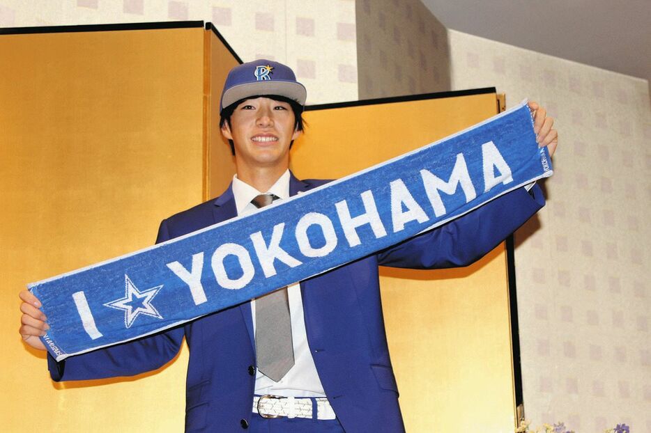 日本ハム・新庄監督のように形から入った。青を基調としたスーツ姿は「もちろん、ベイスターズカラーを一番意識しました」という。靴からベルトまでびしっと決め、上着を開け閉めするファッションショーのようなポーズをとった。