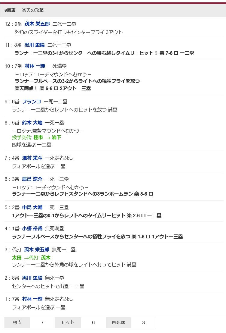 【楽天対ロッテ16回戦】楽天、6回裏に一挙7点を取り逆転!黒川が勝ち越しタイムリー!!!!!!!!!!!!!!