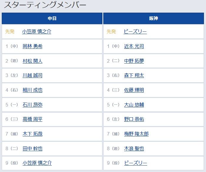 【中日対阪神19回戦】6(左) 野口 恭佑 3(左) 川越 誠司