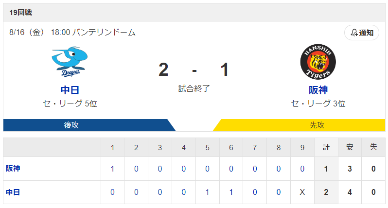 阪神が中日に敗れ首位カープと4.5G差!優勝争いは巨人との一騎打ちへ