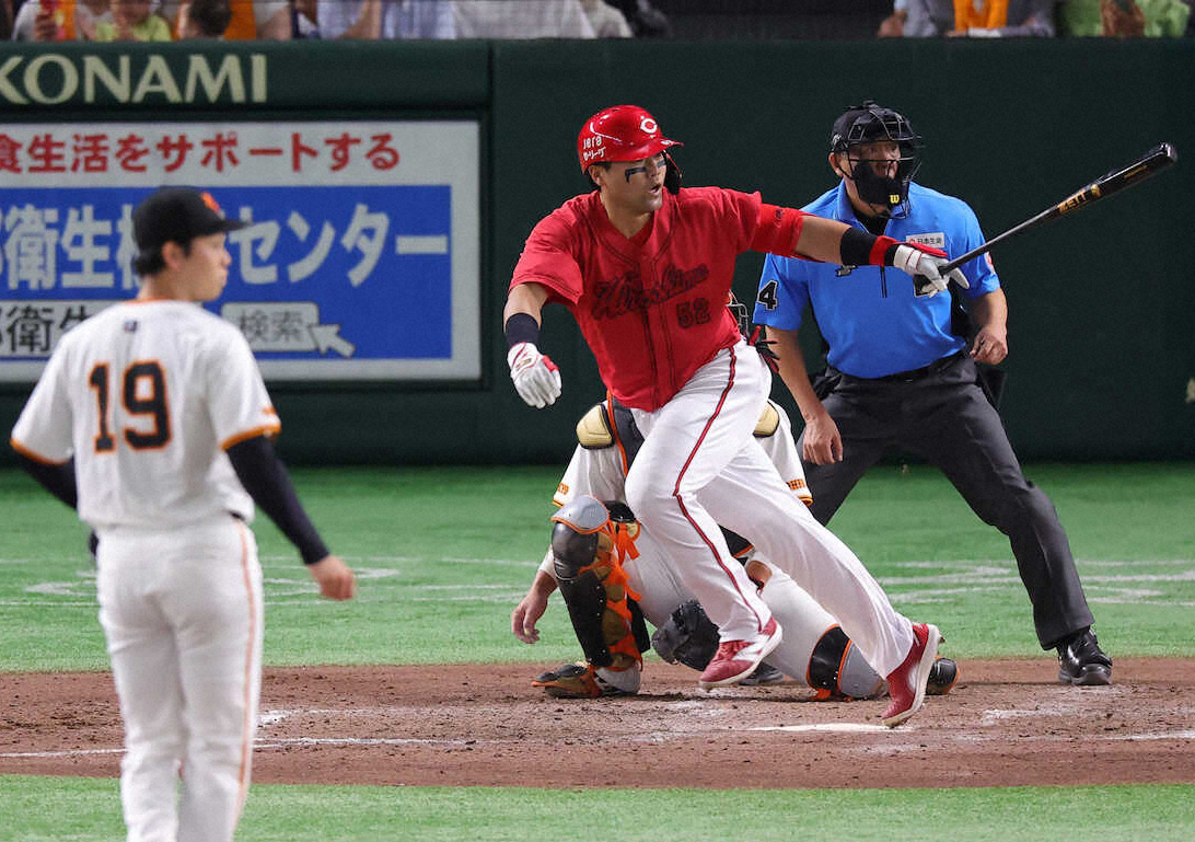 試合前には高松商の後輩、浅野と談笑。14日の阪神戦で放ったプロ初の満塁弾を「おめでとう。チャンスだね」と称え、「1人しかいない後輩なので。食らいついてでも1軍にいることが大事。そこはチームは関係ない」と笑った。今季初めて同じ試合で対決し、8学年上の先輩の貫禄を示した5打点。巨人を2差へ突き放し、今回3連戦中に首位を明け渡す可能性を消した。