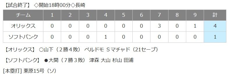 【ソフトバンク対オリックス17回戦】オリックスが4-1でソフトバンクに逆転勝ち!山下が自己最速更新の161キロをマークし7回1失点で今季2勝目!打線は3連続押し出しで勝利!