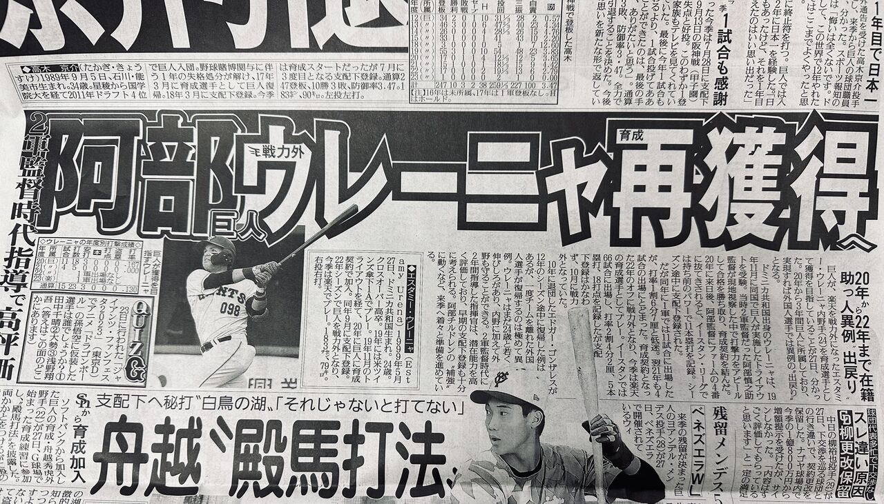 巨人、ウレーニャを育成で再獲得へ