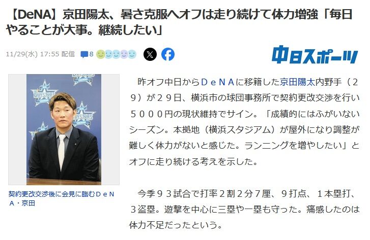 昨オフ中日からDeNAに移籍した京田陽太内野手(29)が29日、横浜市の球団事務所で契約更改交渉を行い5000円の現状維持でサイン。