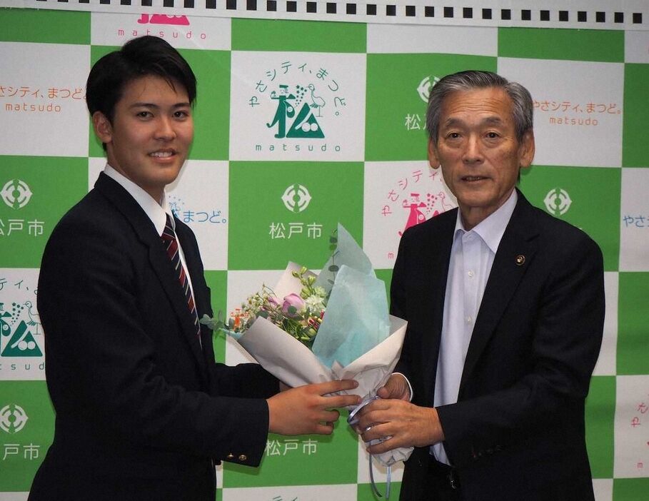 本郷谷健次市長から直接、花束を贈られた早坂は、やや緊張した面持ちながら「プロの世界で活躍して、松戸市の名前を全国に響かせられたら」と、自らの名前「響」を織りまぜて決意を表明。本郷谷市長は「たくさんの人がみんな応援しているので、力を十二分に発揮して思う存分、頑張ってください」と激励した。