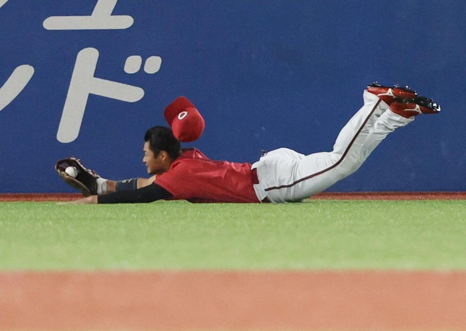 初回2死で打席にはサンタナ。フルカウントから直球を引っ張り強烈なライナーを放つも、これをダイビングキャッチ。先発・大瀬良も好プレーに手をたたいて賛辞を贈り、ベンチ前で出迎えた。