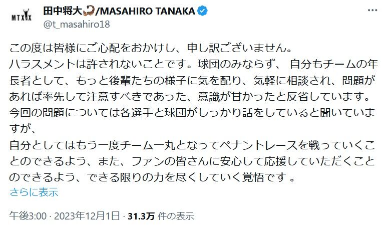 田中将大が謝罪「意識が甘かった」 安樂のパワハラ問題に初言及…SNSを更新