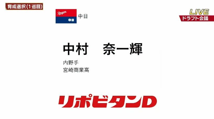 中村 奈一輝 (内野手・宮崎商業高)https://t.co/sv8Z7NO34s#NPB #ドラフト会議 #ドラフト— 日本野球機構(NPB) (@npb) October 24, 2024