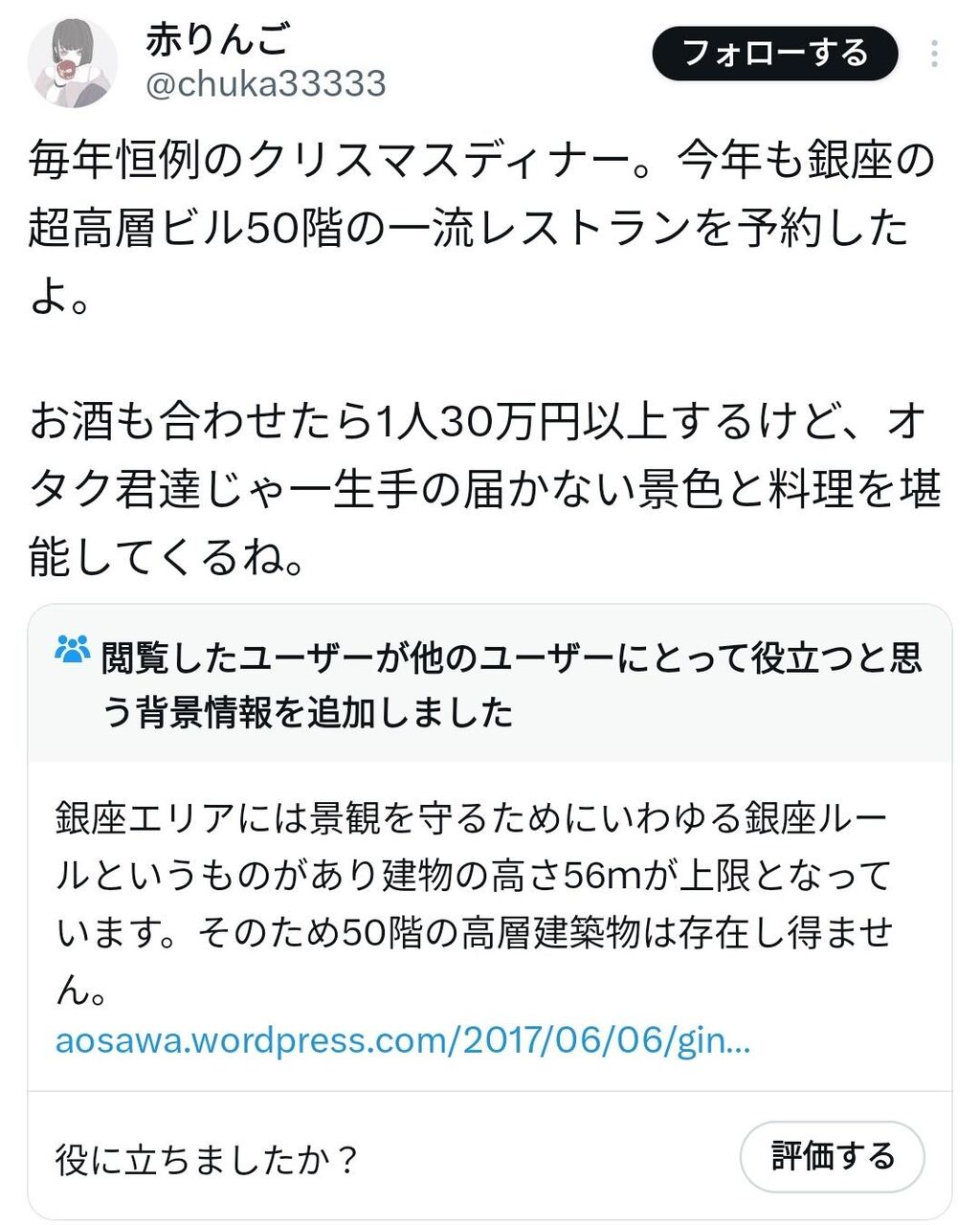 港区女子「50階で30万のディナー。弱男は一生味わえないだろうね」⇨コミュニティノートで嘘松