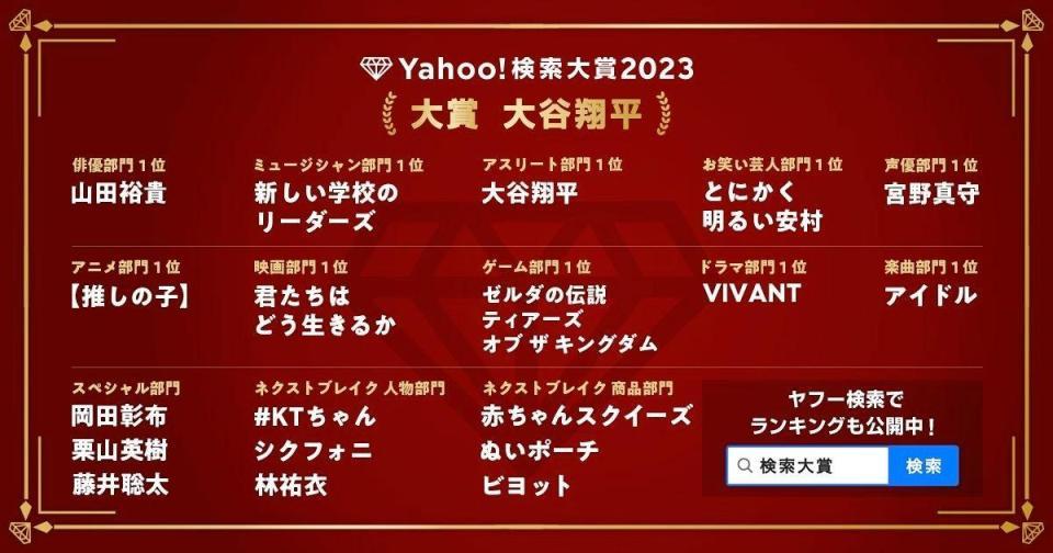 2023年に最も検索数が急上昇した“今年の顔”を表彰する、「Yahoo!検索大賞2023」が5日、発表され、米大リーグ・エンゼルスの大谷翔平選手が「大賞」と「アスリート部門」1位をダブル受賞した。