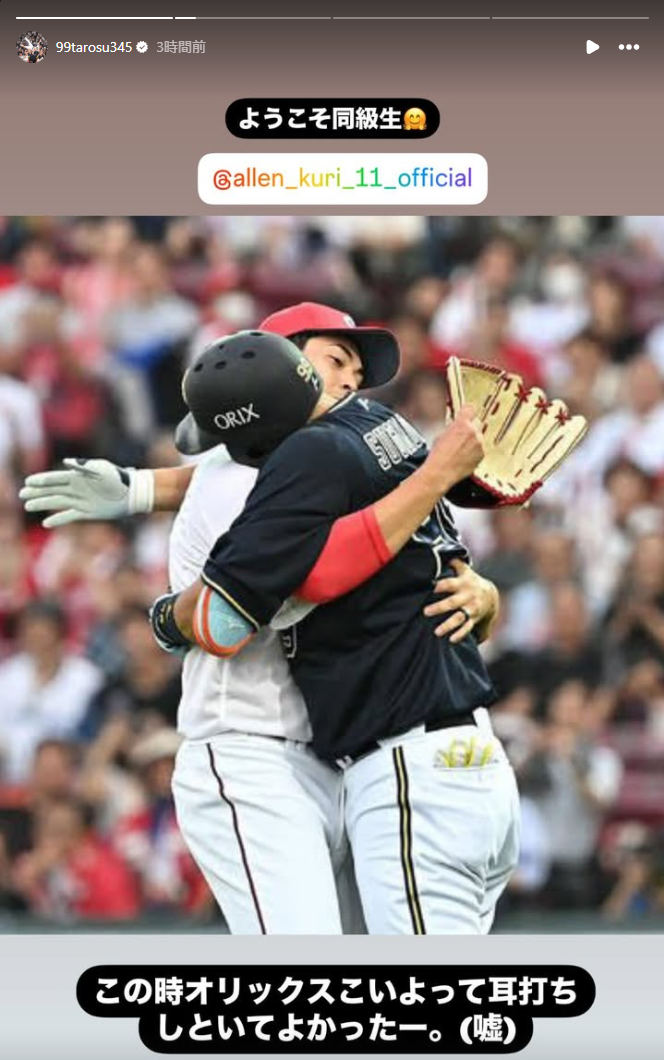 オリ杉本がカープ九里の入団喜ぶ「ようこそ同級生」歓迎メッセージをインスタに投稿