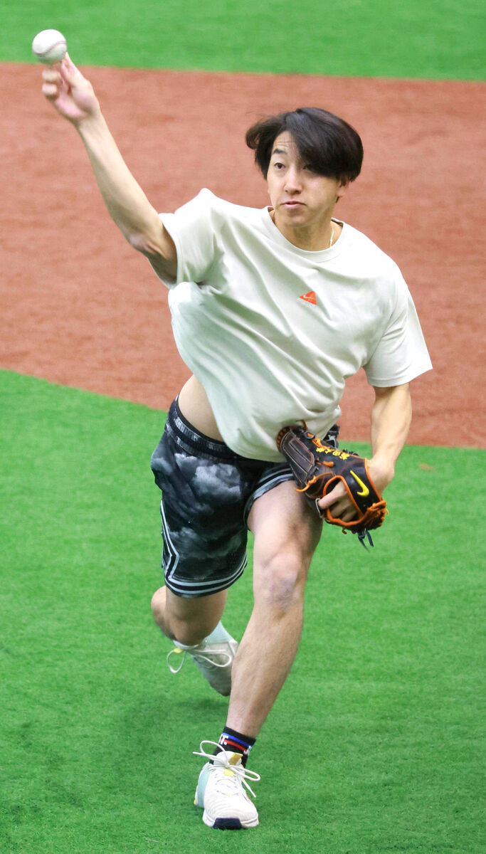闘志が燃えたぎっていた。気温8度の室内練習場に半袖、半ズボン姿で登場。「なんでいるの?」と驚きの声を上げるチームメートに「飛行機に乗り遅れました」と冗談めかした背番号15。キャッチボールでブルペン捕手のミットに剛球を突き刺し「暑い。ずっとオーバーヒートしています」と豪快に笑った。