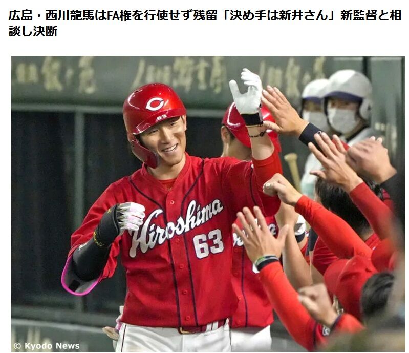 【1年前】広島・西川龍馬はFA権を行使せず残留「決め手は新井さん」新監督と相談し決断