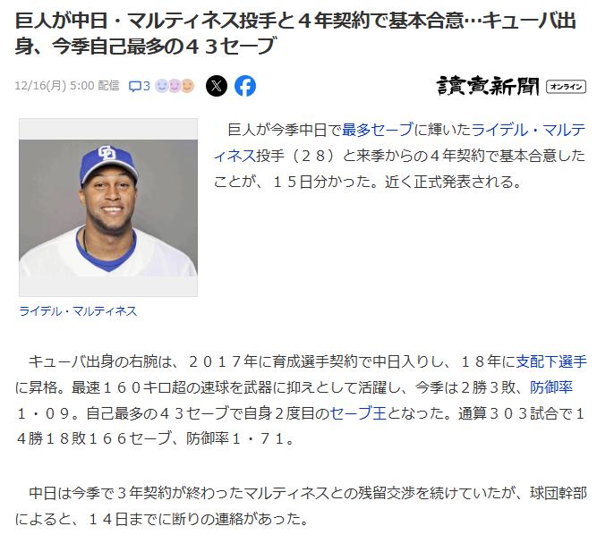 【朗報】2年契約と噂されていたR・マルティネスとの契約、実は4年50億円超だった