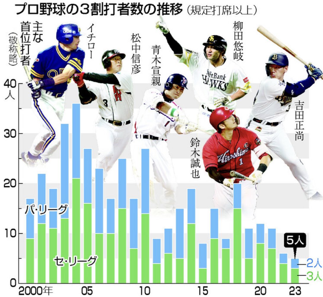 20年前のプロ野球「3割打者は年20人以上います」最近のプロ野球「年10人以下です」←これ