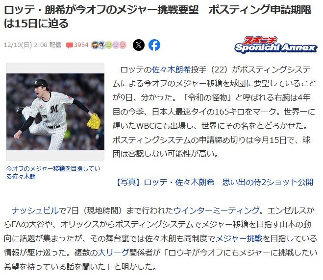 スポニチ「佐々木朗希が今オフメジャー挑戦要望」→以降他紙の報道なし