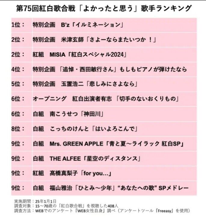 今年は白組の勝利となった紅白だが、もっともあなたの心に届いた歌はどれだっただろうか? 紅白を視聴した人々を対象に、特別企画を含むすべてのパフォーマンスの中で最もよかったと思うものを聞いた。