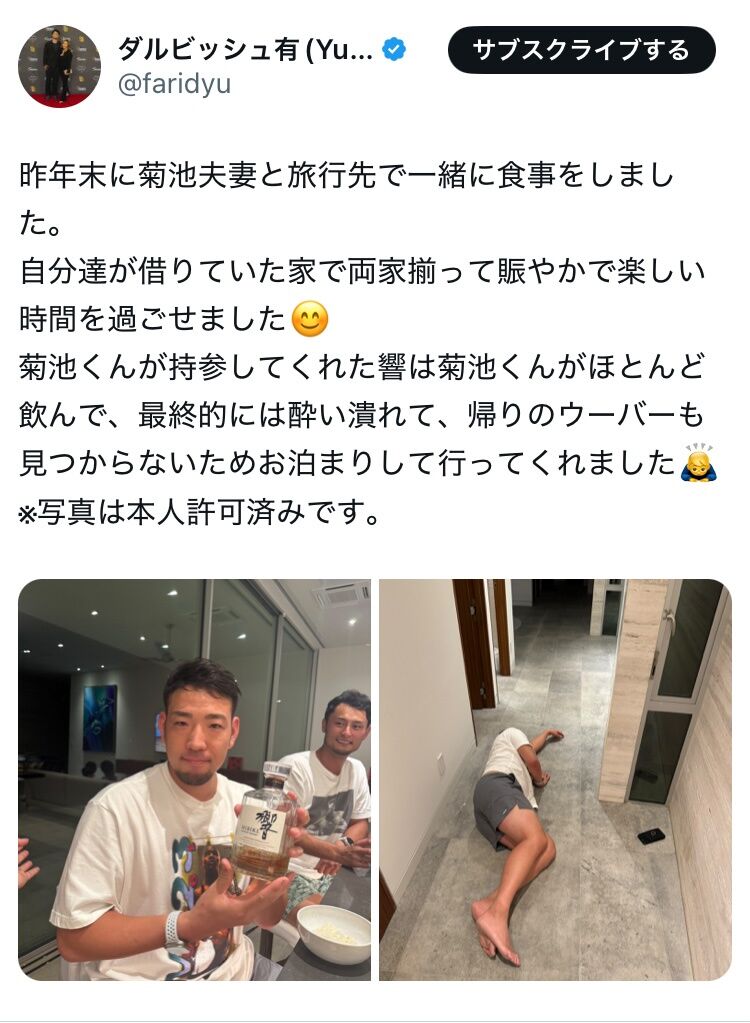 菊池くんが持参してくれた響は菊池くんがほとんど飲んで、最終的には酔い潰れて、帰りのウーバーも見つからないためお泊まりして行ってくれました🙇♂️… pic.twitter.com/gzemGj5uR7— ダルビッシュ有(Yu Darvish) (@faridyu) January 6, 2025