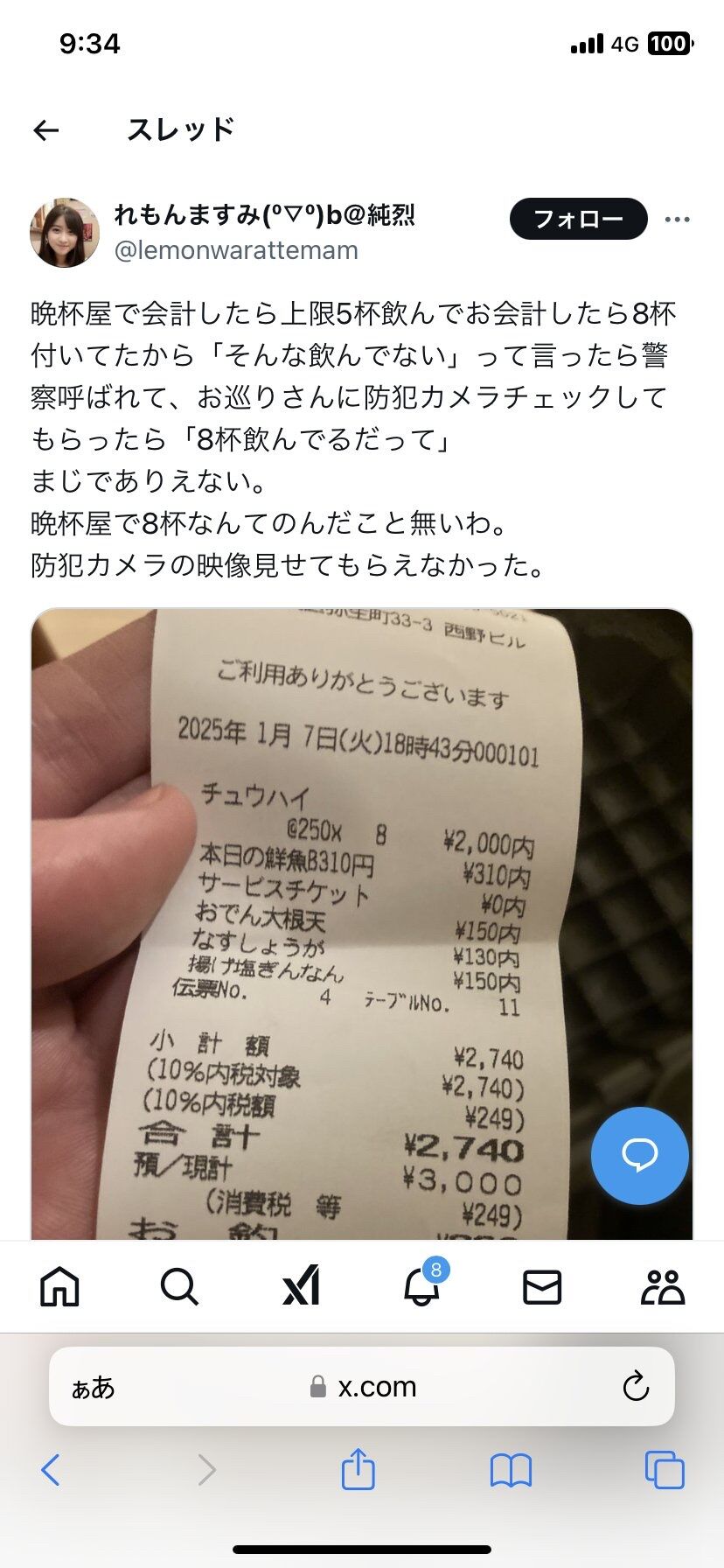 【悲報】客「居酒屋で5杯しか飲んでないのに8杯の値段取られた」→店「説明します」