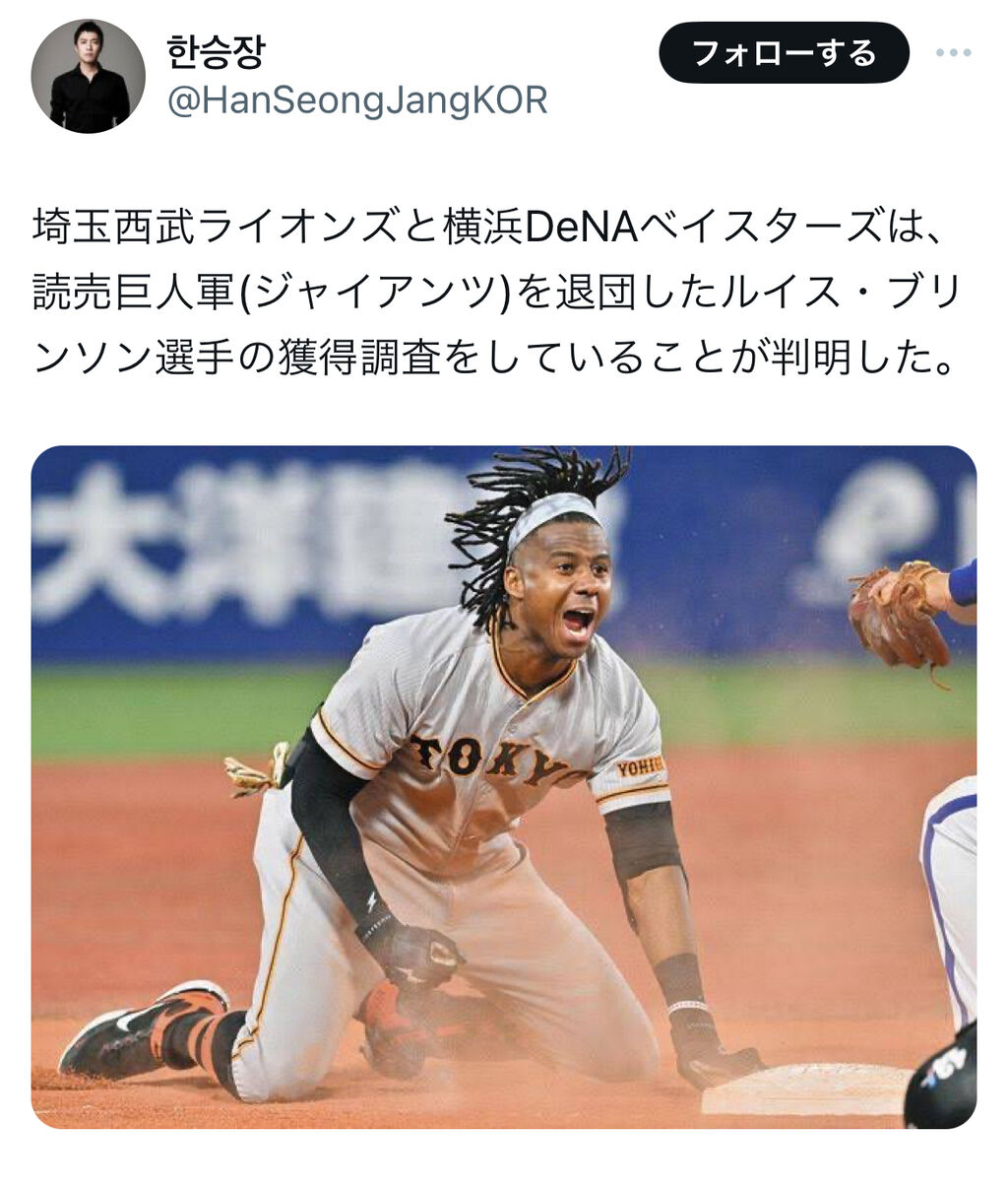 埼玉西武ライオンズと横浜DeNAベイスターズは、読売巨人軍(ジャイアンツ)を退団したルイス・ブリンソン選手の獲得調査をしていることが判明した。 pic.twitter.com/5Gi8B4GwjD