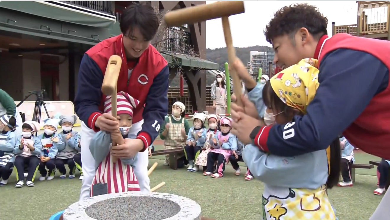 カープ森下、堂林らが幼稚園児と餅つき!森下「おいしいお餅を食べて来シーズンも頑張りたい」
