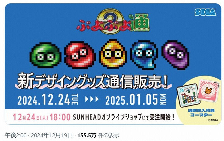 アニメ・ゲーム・キャラクターグッズの企画・製作を手がける株式会社SUNHEADプロダクションは15日、公式SNSを通じ、昨年12月24日から販売を開始した「ぷよぷよ」新デザイングッズの販売を中止すると発表した。想定を大きく下回る受注数だったため、製造販売を断念せざるを得ない状況となった。
