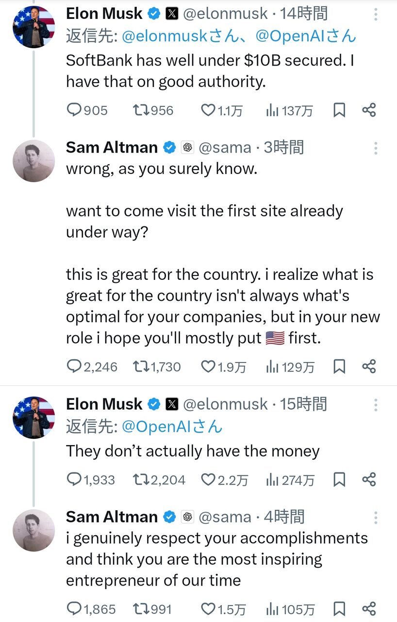 孫正義「AIインフラに4年間で78兆円を投資する」イーロン「そんな金無いだろ」