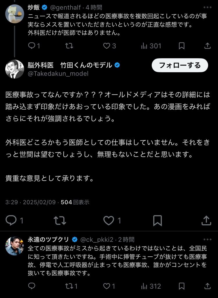 脳外科医 竹田くんのモデル「医療事故ってなんですか???オールドメディアは印象だけあおっている」