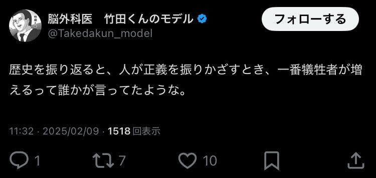 脳外科医 竹田くんのモデル「歴史を振り返ると、人が正義を振りかざすとき、一番犠牲者が増える」
