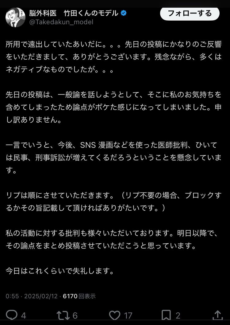 脳外科医 竹田くん「多くのアンチコメを頂きました、今後はSNSや漫画で医師批判も増える」