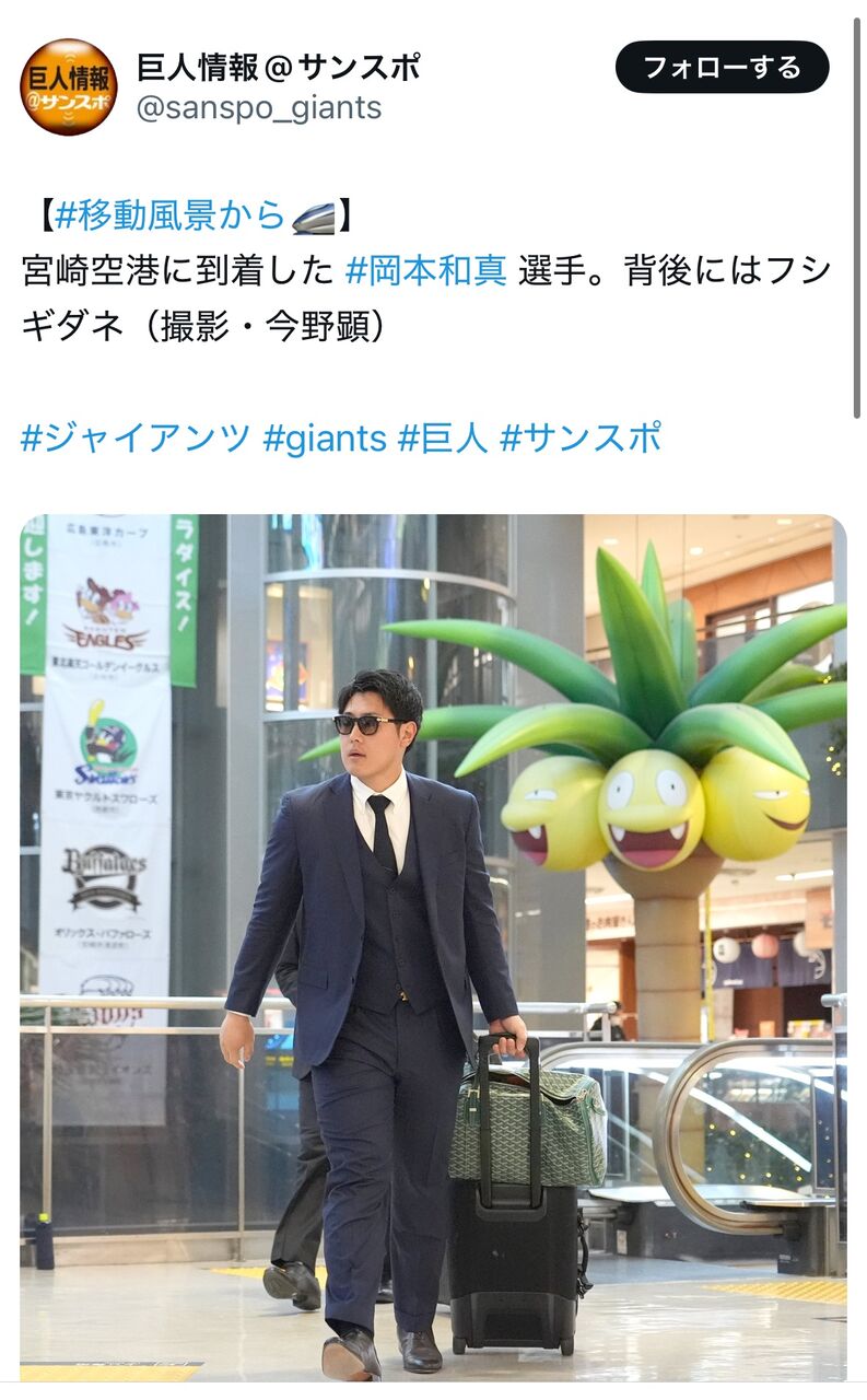 【画像】宮崎空港に到着した巨人岡本、背後にはフシギダネ