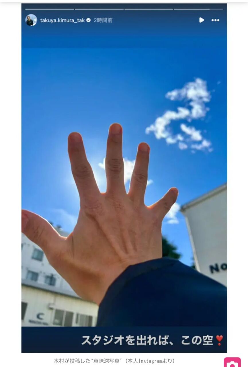 そんななか、翌20日に木村拓哉(52)がInstagramのストーリーズを更新。《スタジオを出れば、この空》という文言とともに太陽に右手をかざす写真を投稿した。Xではさまざまな反響が広がっている。