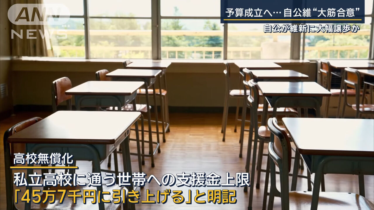 現行の就学支援金は、子どもが私立高校に通う年収590万円未満の世帯には39.6万円を上限に支給している。自民・公明両党と日本維新の会は支援に関わる所得の制限をなくした上で、上限額を引き上げる協議を続けている。