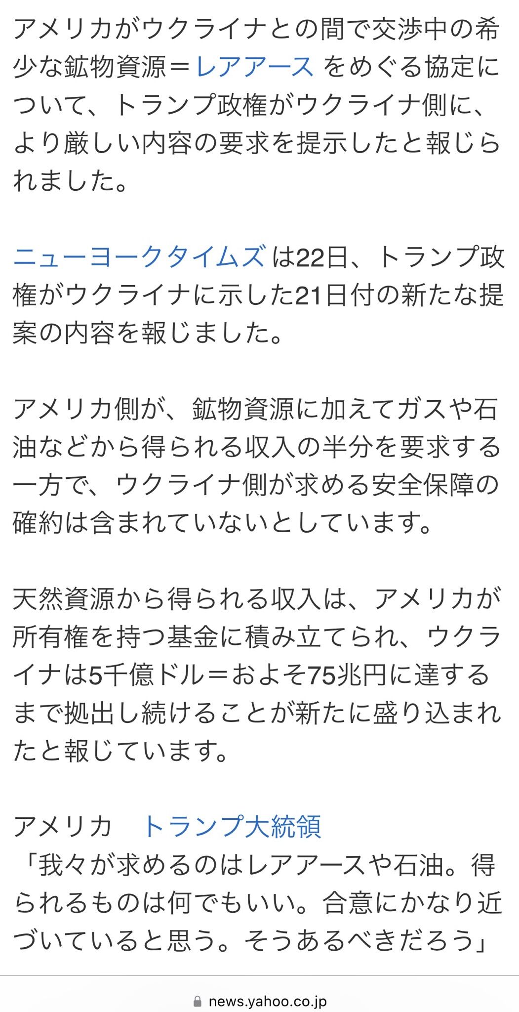 トランプ「レアアースと石油、半分寄越さないならウクライナへの支援打ち切り」