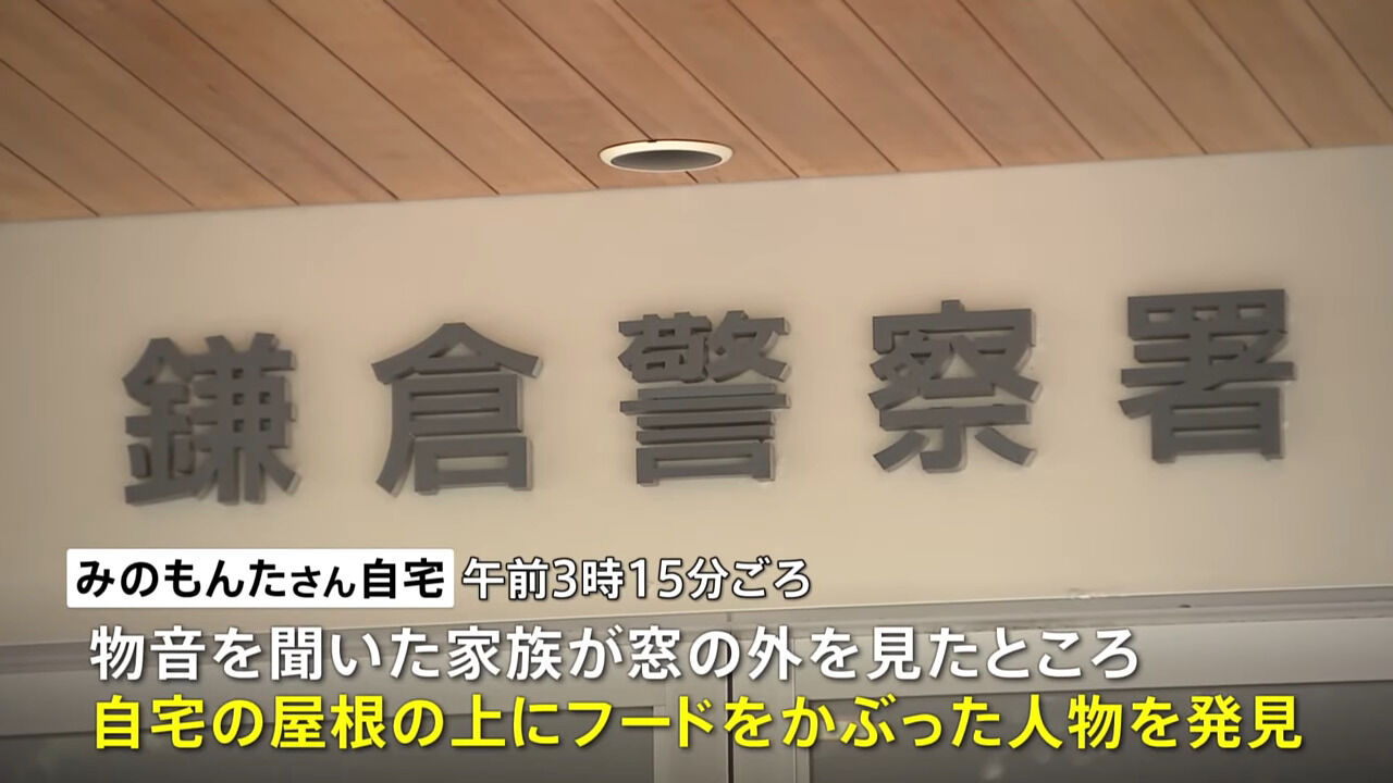きょう午前3時15分ごろ、神奈川県鎌倉市のみのもんたさんの自宅で、物音を聞いた家族が窓の外を見たところ、3階建て自宅の屋根の上にフードをかぶった人物がいるのを見つけました。