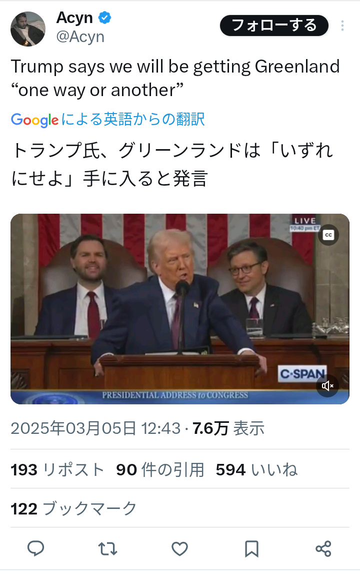 トランプ「グリーンランドはいずれにせよ手に入れる😁」