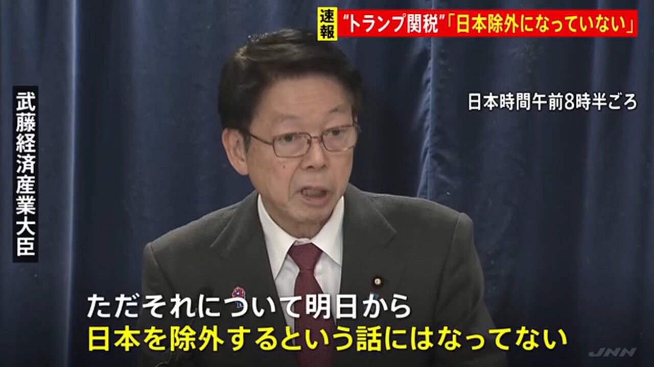 アメリカを訪問している武藤経済産業大臣は、トランプ大統領が予定している関税引き上げについて日本を対象から外すよう直談判しましたが、対象外にはなっていないと明らかにしました。